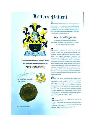 Your Family Arms and your letters Patent on beautiful satin parchment in A3 within 10 days in Australia and 18-24 days after approval for international orders